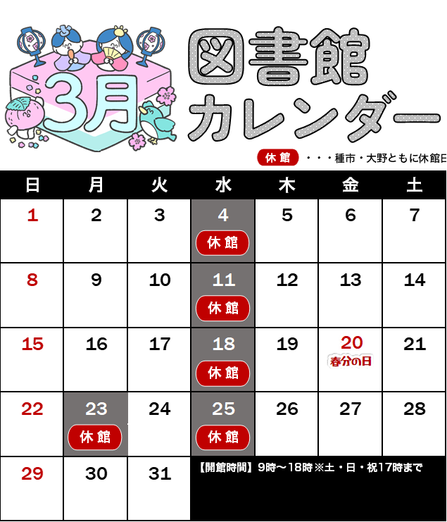 洋野町立図書館の3月のカレンダーについて、添付ファイルをご確認ください。