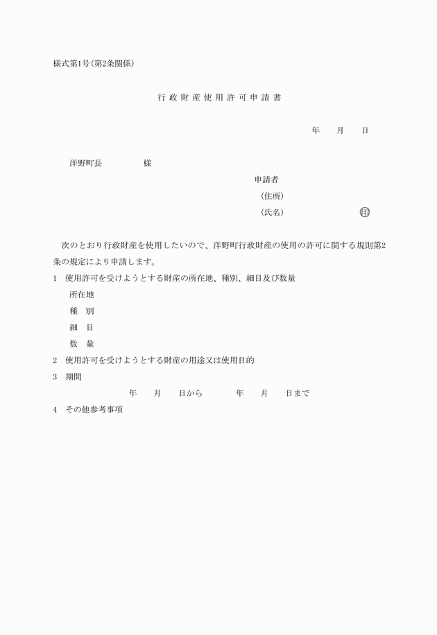 第2条 行政財産の使用の許可を受けようとする者は、行政財産使用許可申請書(様式第1号)を提出しなければならない。