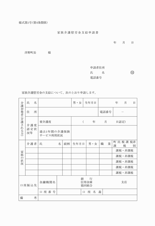 第4条 介護慰労金の支給を受けようとする受給資格者は、家族介護慰労金支給申請書(様式第1号。以下「申請書」という。)に次に掲げる書類を添えて町長に提出しなければならない。