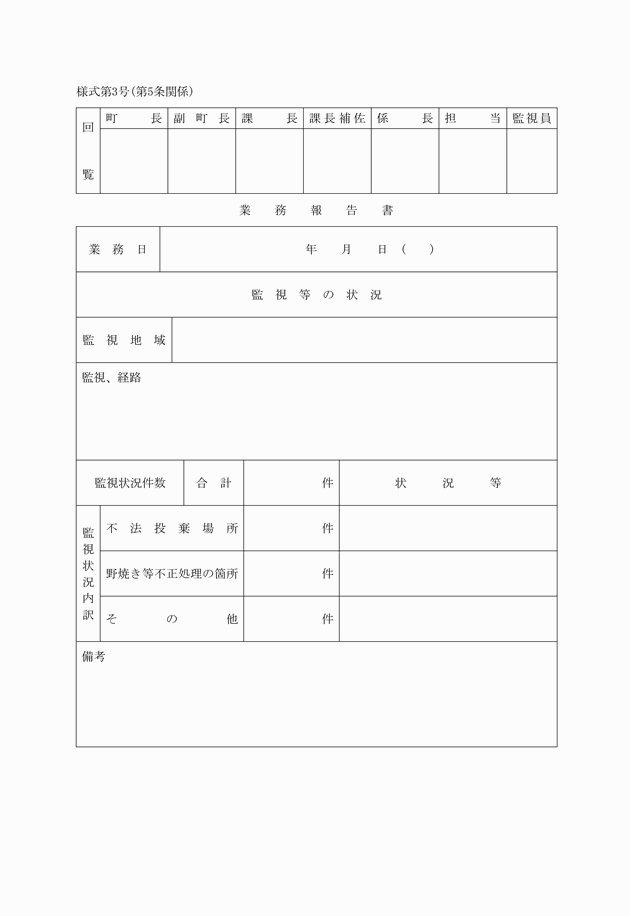 第5条 監視員は、処理した業務の内容について、業務報告書(様式第3号)により、報告しなければならない。