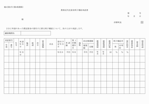 第5条 融資する農業近代化資金について利子補給を受けようとする融資機関は、当該融資について、あらかじめ農業近代化資金利子補給承認申請書(様式第1号)を町長に提出しなければならない。