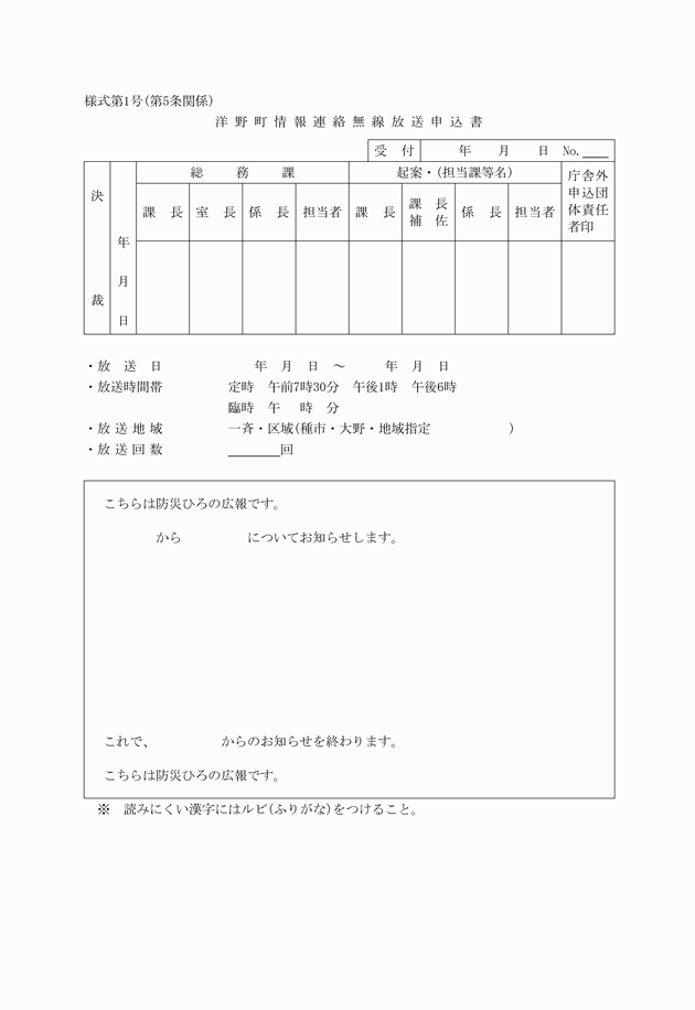 第5条 施設を利用する場合は、洋野町情報連絡無線放送申込書(様式第1号。以下「申込書」という。)により管理者に提出するものとする。ただし、固定系子局(屋外拡声方式)により直接行う場合は、町長が定める者の許可を得て使用するものとする。