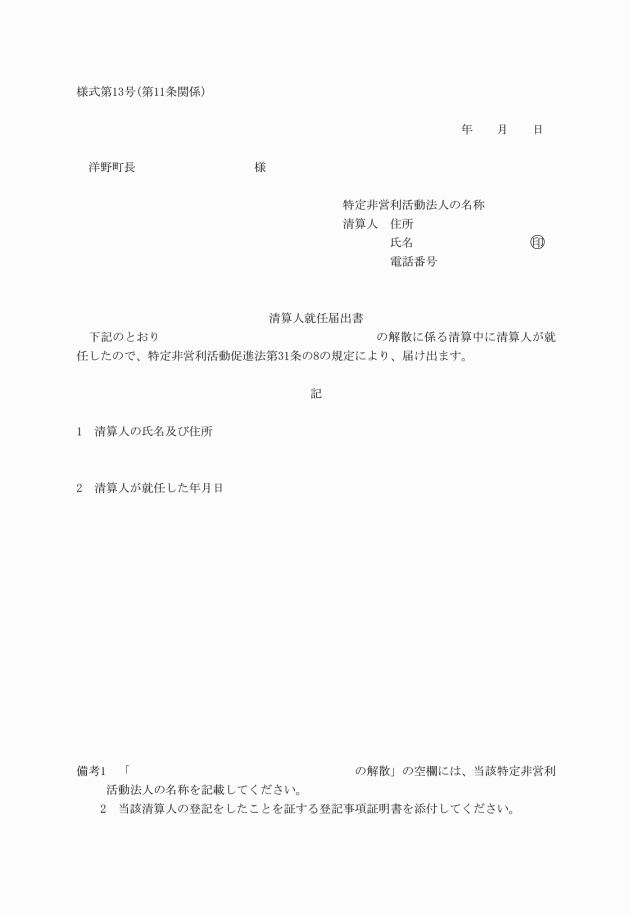 2 法第31条の8の規定による届出は、当該清算人の登記をしたことを証する登記事項証明書を添付した清算人就任届出書(様式第13号)を町長に提出してするものとする。