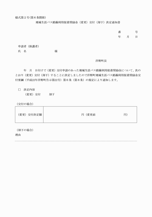 第5条 この告示に定める奨励金を受けようとする者(以下「申請者」という。)は、地域生活バス路線利用促進奨励金交付申請書(様式第1号。以下「申請書」という。)を町長に対し提出するものとする。