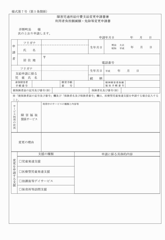 第5条 法第21条の5の8の申請書は、障害児通所給付費支給変更申請書兼利用者負担額減額・免除等変更申請書(様式第7号)によるものとする。