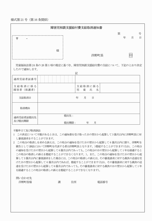 第7条 法第21条の5の9第1項に規定する通所給付決定の取消しを行ったときの通知は、支給決定取消通知書(様式第9号)によるものとする。