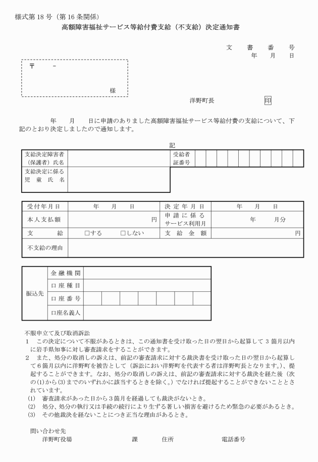 第13条 法第19条第1項、第34条第1項及び第51条の5の支給決定を受けようとするときは、省令第31条第1項、第34条の4第1項及び第34条の53第1項に規定する事項を記載した、特例介護給付費・特例訓練等給付費・特例特定障害者特別給付費・特例地域相談支援給付費(以下「特例介護給付費等」という。)支給申請書(様式第15号)に、特例介護給付費又は特例訓練等給付費の額、特例特定障害者特別給付費の額又は特例地域相談支援給付費の額を証する書類を添付して、町長に申請するものとする。