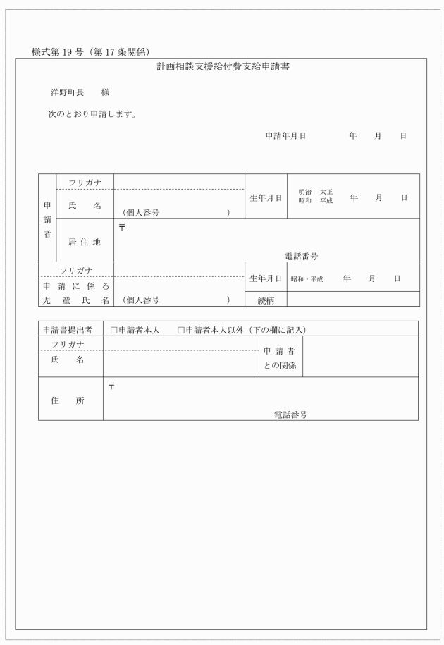 第17条 省令第34条の54第1項に規定する申請は、計画相談支援給付費支給申請書(様式第19号)によるものとする。