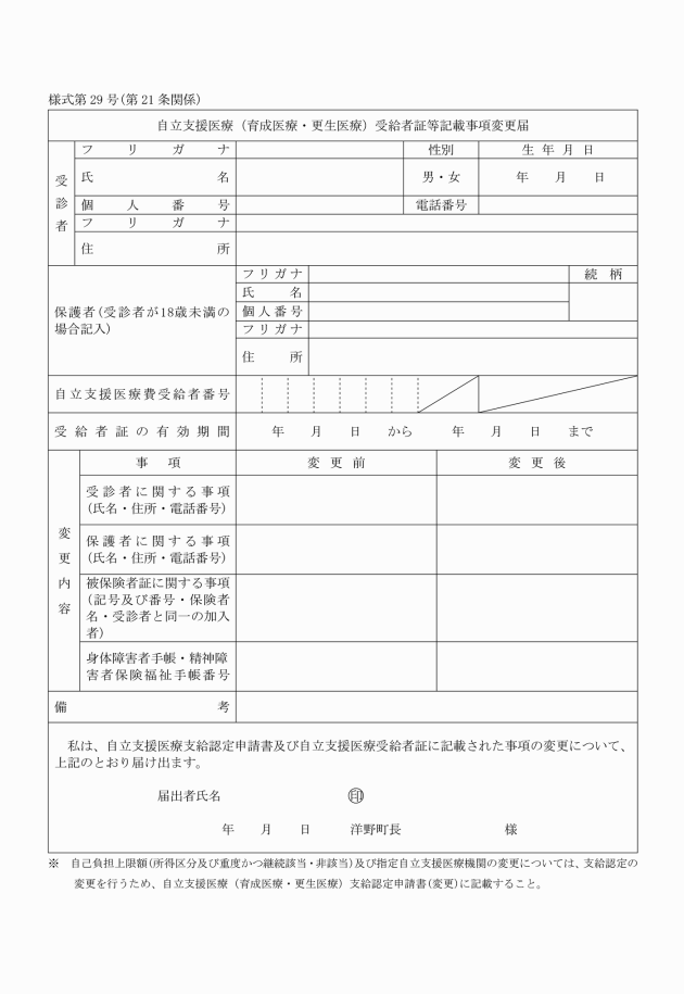 第21条 政令第32条第1項に規定する届出は、自立支援医療(育成医療・更生医療)受給者証等記載事項変更届(様式第29号)により行わなければならない。