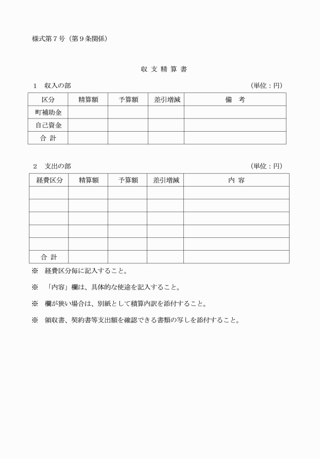 第7条 町長は、予算の執行の適正を期するため、補助事業者に対して、必要な報告を求め、又は職員に、その事務所、事業場等に立ち入り、帳簿書類その他の必要な物件を検査させ、若しくは関係者に質問させることができる。