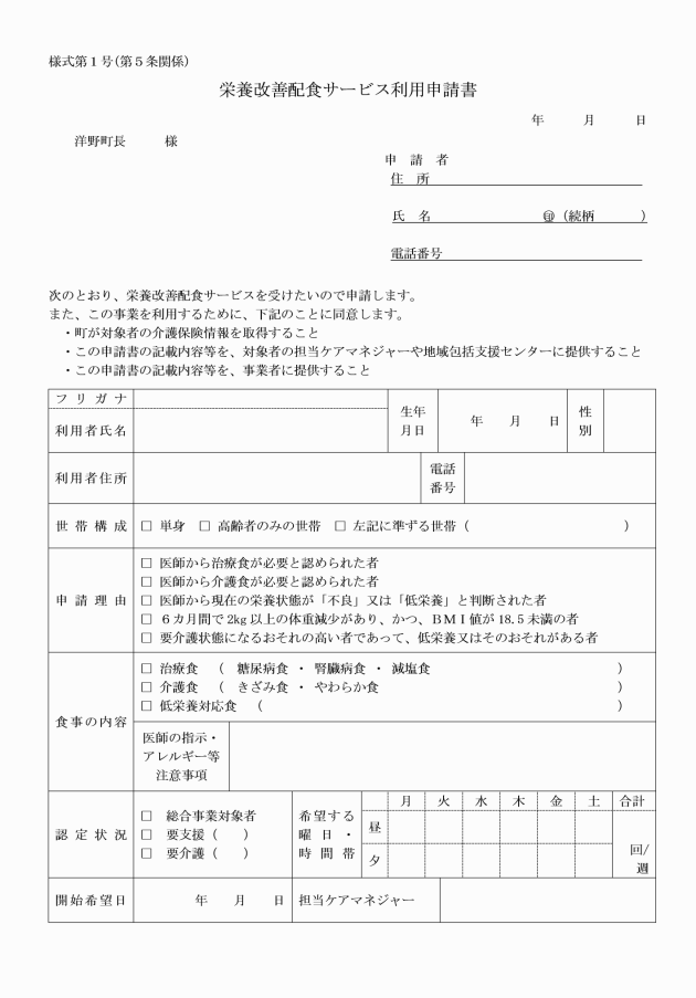 第12条 町長は、栄養改善配食サービスの利用を決定した者について、氏名、住所、年齢、改善目的等を栄養改善配食サービス事業利用者台帳(様式第9号)に登載するものとする。