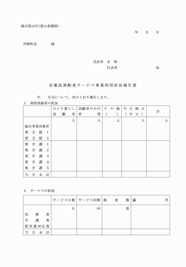 第13条 受託者は、毎月15日までに前月分の栄養改善配食サービス事業利用状況報告書(様式第10号)を作成し、町長に提出するものとする。